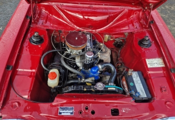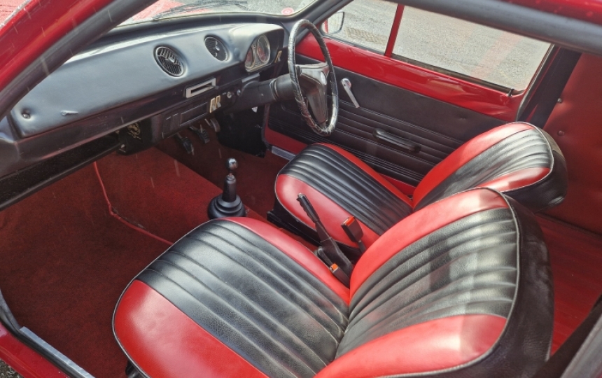Interior - Standard seats but outer bolsters have been dyed red. 70s custom look trim in the back which is easily removed. Standard door cards, dash and steering wheel.
