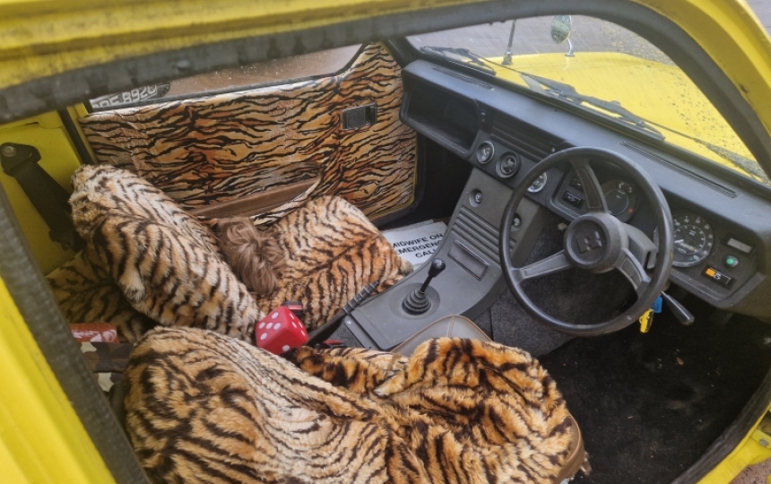 Period accessories include leopard skin door cards and seat covers re trimmed with the contents of Marlenes wardrobe. Roof rack, "dahn the market" suitcase, Rodney camouflage jacket and wig. Inflatable Lusty Lolita although she has went down. ...no not in that way!!!! take your mind out the gutter. The all important "midwife on emergency call" sign so you can park anywhere, of course.