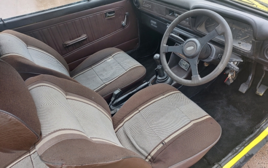 Interior - Original sport seats which are quite worn. Door cards are original with no speaker holes but a bit worn. Dashtop has been recovered and not done great. .Headlining is OK. Original steering wheel which looks like a rabid Alsation has been biting chunks out of it.