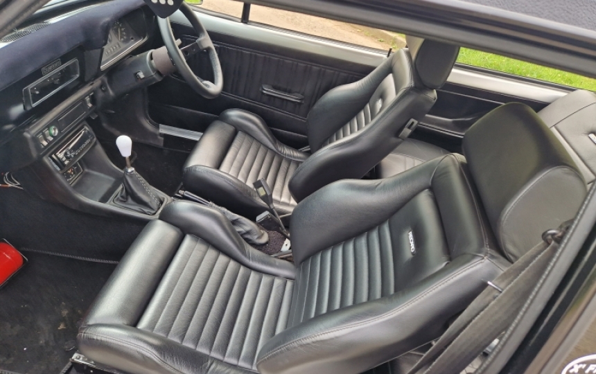 Interior - Flocked dashtop, front Recaros fully retrimmed in leather. Proper nice job with the rear seats done to match. Good door cards, carpet and headlining. Early white needle sport / ghia clocks which all work. Car is as nice inside as it is out.