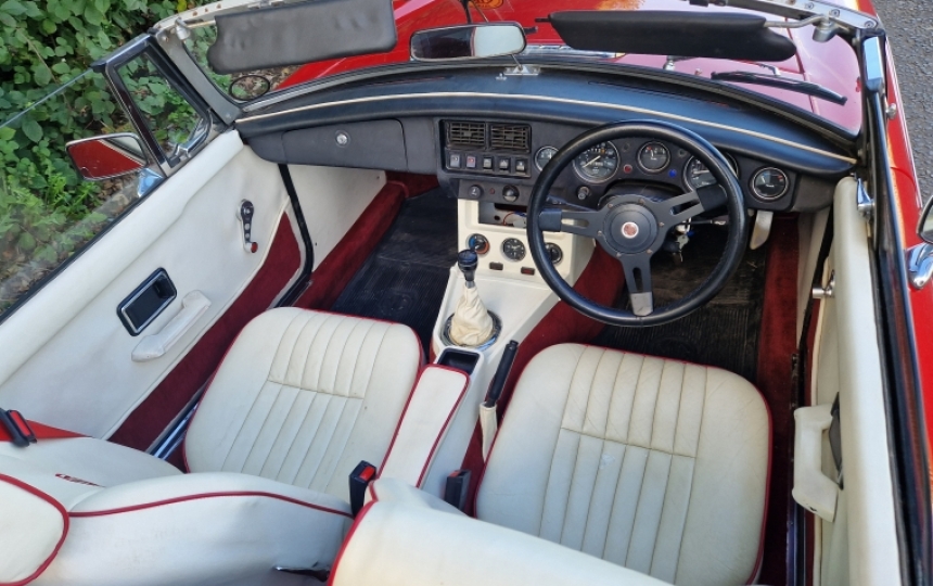 Interior - White Interior which may divide the crowd but ib very good order. Small mark on base of drivers seat. Matching door panels and kick panels. MG logo embroidered into seat backs. Matching red seat belts.