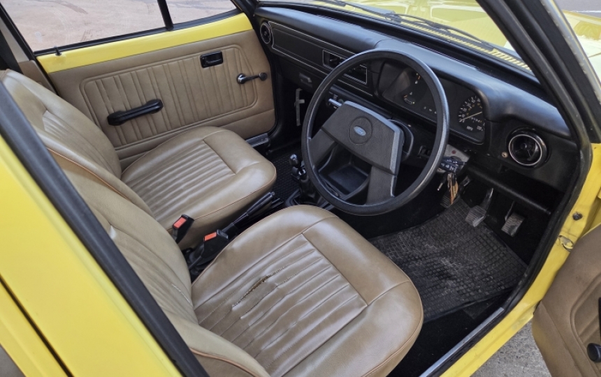 Body - Mk2 Escort 4 door. This car has its original inner wings, strut tops, sills, arches, boot wells, strut tops, pillars, floors, boot floor. Its never been welded and all looks very good underneath. The paintwork is perfectly presentable. It has picked up a couple of minor scuffs over the years but overall a tidy old car which will turn heads wherever it goes. The colour is its original, which is Mimosa Yellow, a South African colour